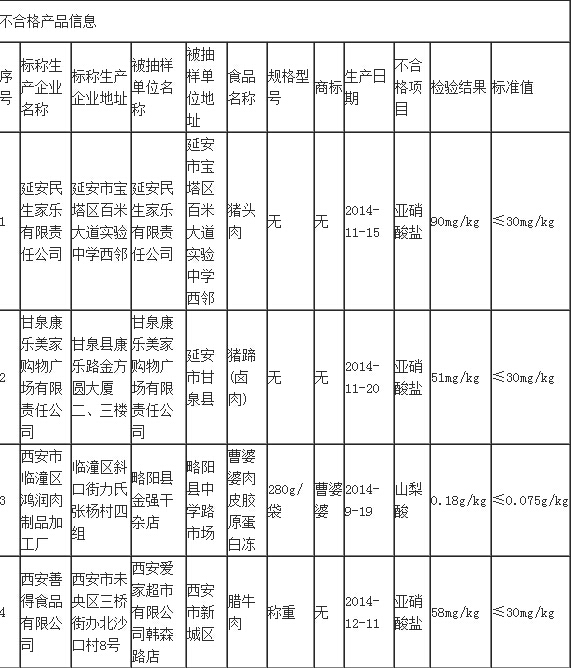 其中,肉及肉制品不合格樣品所涉及的標稱企業(yè)、產(chǎn)品和不合格指標為:延安民生家樂有限責任公司生產(chǎn)的豬頭肉、甘泉康樂美家購物廣場有限責任公司生產(chǎn)的豬蹄(鹵肉)、西安善得食品有限公司生產(chǎn)的臘牛肉亞硝酸鹽超標,西安市臨潼區(qū)鴻潤肉制品加工廠生產(chǎn)的曹婆婆肉皮膠原蛋白凍山梨酸超標。