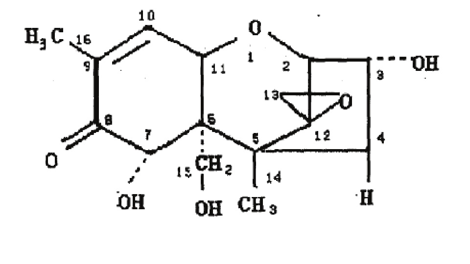 嘔吐毒素是一種單端孢霉烯族毒素,主要由粉紅鐮刀菌和禾谷鐮刀菌產(chǎn)生。其化學名為3α,7α,15-三羥基-12,13-環(huán)氧單端孢霉-9-烯-8-酮,化學式為C15H20O6,純品是一種無色針狀結(jié)晶,可在乙酸乙酯和甲醇中長期保存。低劑量的嘔吐毒素,主要引起動物食欲下降、體重減輕、代謝紊亂等癥狀,大劑量可導致動物嘔吐。嘔吐毒素對消化系統(tǒng)、血液系統(tǒng)、中樞系統(tǒng)以及鈣磷代謝均產(chǎn)生影響,嘔吐毒素具有慢性和亞慢性毒性、急性毒性、免疫毒性等多種毒性作用。