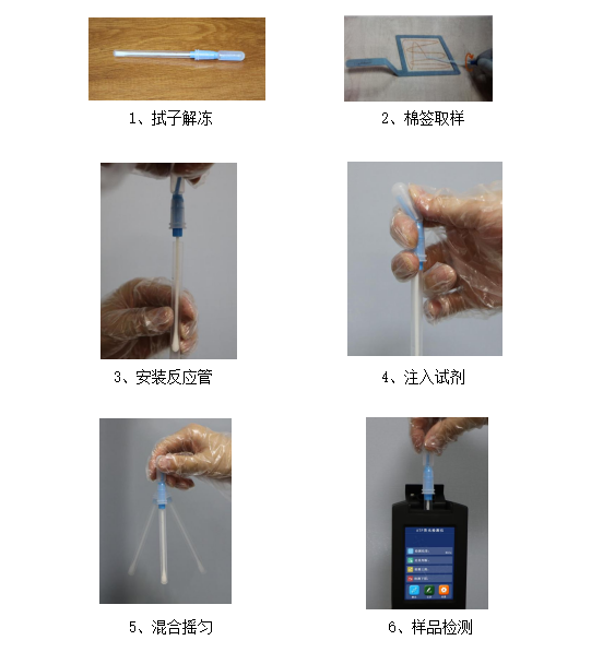 6、樣本檢測:將拭子插入處于待檢測界面的ATP儀器實驗倉內(nèi),閉合儀器上蓋,開始檢測。