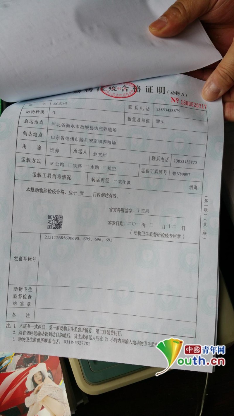 此后中國(guó)青年網(wǎng)記者致電編號(hào)為1300620717檢疫證明存根聯(lián)上的趙姓“承運(yùn)人”進(jìn)一步核實(shí),對(duì)方告訴中國(guó)青年網(wǎng)記者,他以前確實(shí)到故城運(yùn)過(guò)牛,但“都是半年前的事了”,并不是檢疫證明上寫(xiě)的2月12號(hào),而且數(shù)量也不對(duì)。檢疫證明是“通過(guò)中間人開(kāi)的”,他并沒(méi)有見(jiàn)到,并且運(yùn)的是6頭“奶?!?,并不是屠宰用的肉牛。