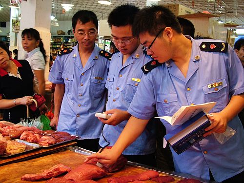 隨后,記者向食藥監(jiān)部門反映此事,當(dāng)日14時(shí)許,海口市瓊山區(qū)中山食品藥品監(jiān)督管理所執(zhí)法人員趕到現(xiàn)場(chǎng)。執(zhí)法人員用手摸了摸攤位上的牛肉,并沒(méi)有立即做出判斷?!笆遣皇亲⑺H?,通??梢杂檬置?,看看黏不黏手,但這不能作為執(zhí)法的依據(jù)?!眻?zhí)法人員隨即聯(lián)系了瓊山區(qū)食品藥品監(jiān)督管理局有關(guān)負(fù)責(zé)人,詢問(wèn)是否可以用食品快檢車檢測(cè)注水肉,得到的答復(fù)是“暫時(shí)不可以”。該執(zhí)法人員稱,目前??谑乘幈O(jiān)部門正計(jì)劃引進(jìn)一種可以快速檢測(cè)注水肉的儀器CSY-R肉類水分測(cè)定儀,待儀器配備到位后,他們將對(duì)培龍市場(chǎng)的所有鮮肉攤進(jìn)行檢測(cè),排除隱患。