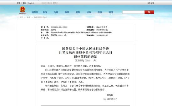 9月3日放假1天原標(biāo)題:國(guó)務(wù)院關(guān)于中國(guó)人民抗日戰(zhàn)爭(zhēng)暨世界反法西斯戰(zhàn)爭(zhēng)勝利70周年紀(jì)念日調(diào)休放假的通知