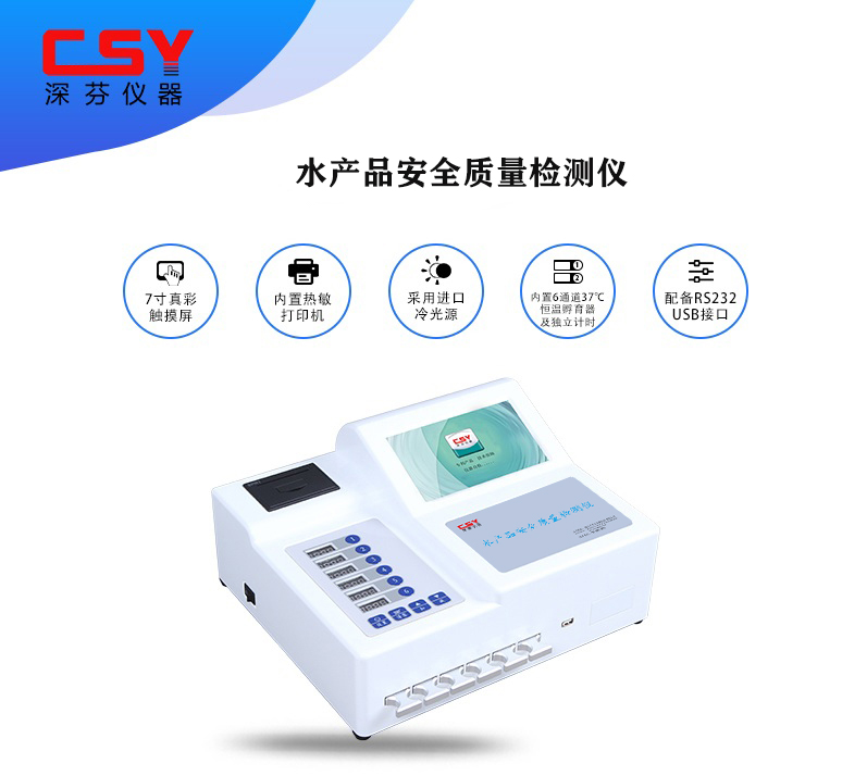 水產(chǎn)品安全質(zhì)量檢測(cè)儀CSY-JASC水產(chǎn)品安全質(zhì)量檢測(cè)儀能夠快速檢測(cè)呋喃妥因代謝物、呋喃西林代謝物、呋喃它酮代謝物、呋喃唑酮代謝物、氯霉素、孔雀石綠等有毒有害物質(zhì)的含量。